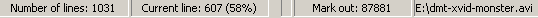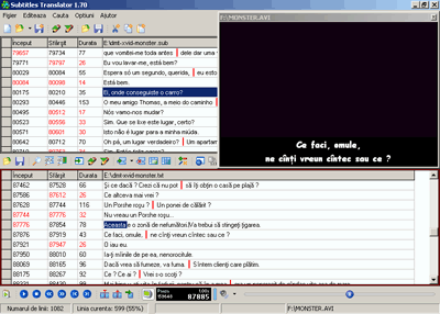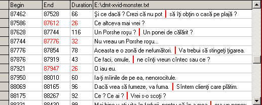 The first column is the tag column. If on a line you have doubts about the translation click in the corresponding square and a tag will be added. Later, you can navigate between tags. If you close the translator, tags will be saved in the project file, so tags are remembered only when using project mode. The second column is the start frame number. It represents the number of the frame in the movie to start displaying the subtitle line. The third column is the end frame number. It represents the number of the frame in the movie to end displaying the subtitle line. The fourth column displays the length of the line, in frames. This is the number of frames the line will be shown when you play the movie. But if you insert here a number, considered by you to be the best length for a line to be displayed the end frame number will be auto-calculated in agreement with this value. And, at last, the fifth column is the subtitle itself column. In this line you must write the translation of the line in the original file. On the top you have the path to the file you are editing, in this case the drive is E:\ and the file is dmt-xvid-monster.txt, located in the root pf E: drive. If you haven’t made modifications by inserting lines in subtitle, the line you are editing on the lower grid corresponds to the original file on the upper grid (highlighted), like this: