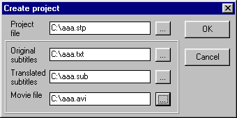 You must fill all the fields before you can go further. After pressing the OK button you’ll find a file named (in this example) aaa.stp in the root of drive C. The file can be edited with a text editor. It contains information about files and their locations. If you load first the original subtitle, the movie and the target translated file when you select the Create Project option, the corresponding fields are filled. You must only fill the Project file field.