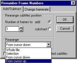Here you can modify the number of the frames of the lines, by adding or subtracting, on the whole file, selected range, from cursor down or up. On the second label named Change frame rate:
