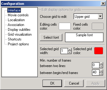 Here you can find some useful functions. Let’s start with the Interface. Here you can modify the grid to be the one to be edited, the upper one or the lower one and the font to use in the ST. Note that this option doesn’t modify the fonts on the subtitle itself. On the selected grid width and color you can modify the color and the width of the border surrounding the selected grid. And, on the bottom of this dialog box are some useful settings. Minimum frames between lines help you to keep always a number of frames between two lines, in case you have to add some frames on a longer sentence. If, at some point, the ending frame number of one line exceeds the start frame number of the next line the number is highlighted in red. Minimum number of frames between begin/end frames help you keep a minimum of frames between the start frame and end frame of a line so the line can be displayed long enough to be easy to read and understand. If, at some point, the difference between the ending frame number and the start frame number is smaller than the selected value the number is highlighted in red. This option don’t modify the subtitle it is only for warning. Suggestion: set the first one at 1 and the second one at the frame rate of the movie, meaning that between two lines it must be left at least 1 frame and the line must be displayed at least one second when playing the movie.