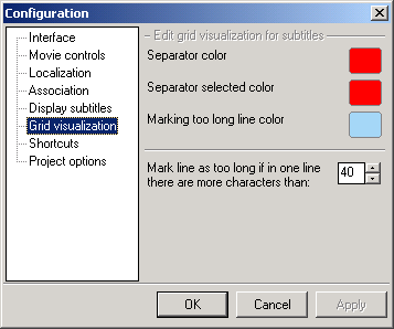 Grid visualization help you to set some visual announcements like changing the color of the separator sign “|” that can be hard to see when is black (between a small L and a caps I for example), and signaling that the line is longer, as number of letters, than an established number you can set (in this example is set to 40 chars on a row). New added feature is to mark a line that has more translation lines than specified in Options->configuration->Display subtitles. This helps you prevent writing a line longer than some players can display or a line that is displayed on the whole movie window (3-4 subtitle lines). Suggestion: 40 characters on a row means that in full screen you can set the font to 22, bold as maximum on an 800x600 display.