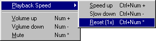 Next we see a bar colored in blue representing the volume, the icon of a speaker who enable/disable sound and a drop button, who pops up a menu, helping to select playback speed and to adjust the volume.