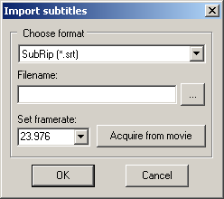 - Import/Export subtitles pop-up a dialog window, asking you to choose the format you want to import/export to, the file from/where you do the import/export and the framerate your video file is. When you have a video file loaded, you can also acquire this information from the video file itself, pressing the Acquire from movie button.