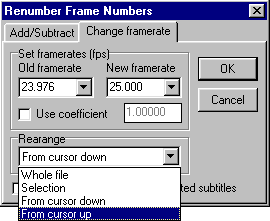 Here you can modify the number of the frames of the lines, by adding or subtracting, on the whole file, selected range, from cursor down or up. On the second label named Change frame rate: