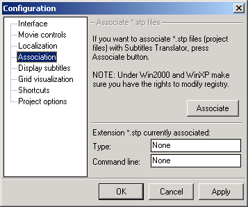 You must fill all the fields before you can go further. After pressing the OK button you’ll find a file named (in this example) aaa.stp in the root of drive C. The file can be edited with a text editor. It contains information about files and their locations. If you load first the original subtitle, the movie and the target translated file when you select the Create Project option, the corresponding fields are filled. You must only fill the Project file field.