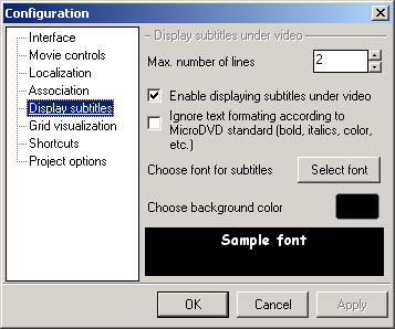 Grid visualization help you to set some visual announcements like changing the color of the separator sign “|” that can be hard to see when is black (between a small L and a caps I for example), and signaling that the line is longer, as number of letters, than an established number you can set (in this example is set to 40 chars on a row). New added feature is to mark a line that has more translation lines than specified in Options->configuration->Display subtitles. This helps you prevent writing a line longer than some players can display or a line that is displayed on the whole movie window (3-4 subtitle lines). Suggestion: 40 characters on a row means that in full screen you can set the font to 22, bold as maximum on an 800x600 display.