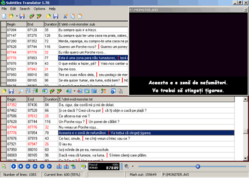 Done ? OK, let’s start translating. Click on the lower grid. The row will be centered by the program (if the lock editing row in middle is enabled) so on the upper grid you can see the original file with the line to be translated centered and highlighted. Start the movie, listen to the dialog if you need and write the translation, using the original file and, if you need so, the sound from the movie. If the movie frame is located between the frames marked at the beginning of the line you should see the translation displayed on the movie window. If you click on the upper grid the original subtitle is displayed on the movie window. When you finish typing a line, press enter key. You will be moved automatically to the next line. If there is something on that line that requires later attention you can go on the first column and add a tag. Later you can navigate between tags. If you need to hear again the dialog to clarify the meaning of the sentence press the Rewind before current line button. It is very helpful. When you finished working save the project.