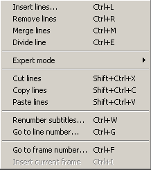 - On the Edit menu we find a group of four functions regarding subtitles: Insert, Remove, Merge and Divide and also expert functions and Cut-Copy-Paste lines functions.